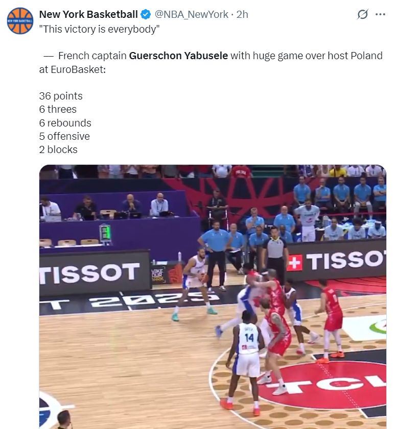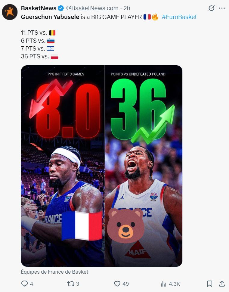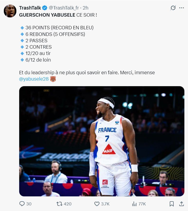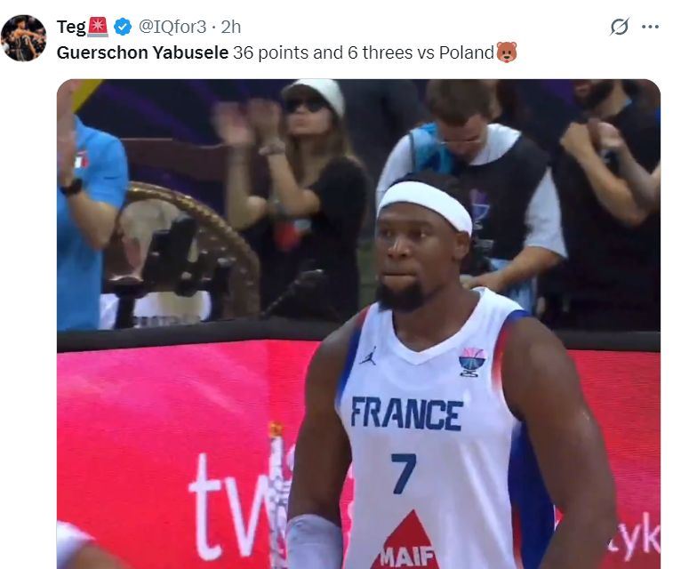 在亚布塞莱命中第六个三分时场边的法国球迷们都起身为他鼓掌,他险些拿到40+的分数,亚布塞莱也激动的怒吼庆祝。