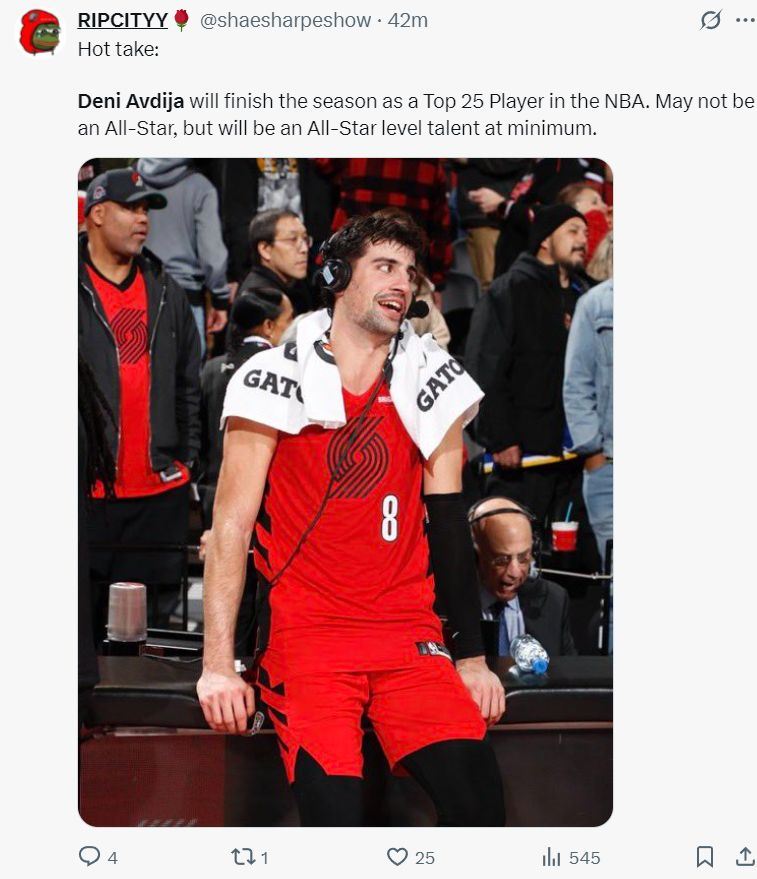 开拓者媒体:我认为阿夫迪亚有希望在下赛季的赛季结束前跻身联盟前25强球星之列,或许他无法进入全明星阵容,但他至少是已经具备全明星水准的球员。