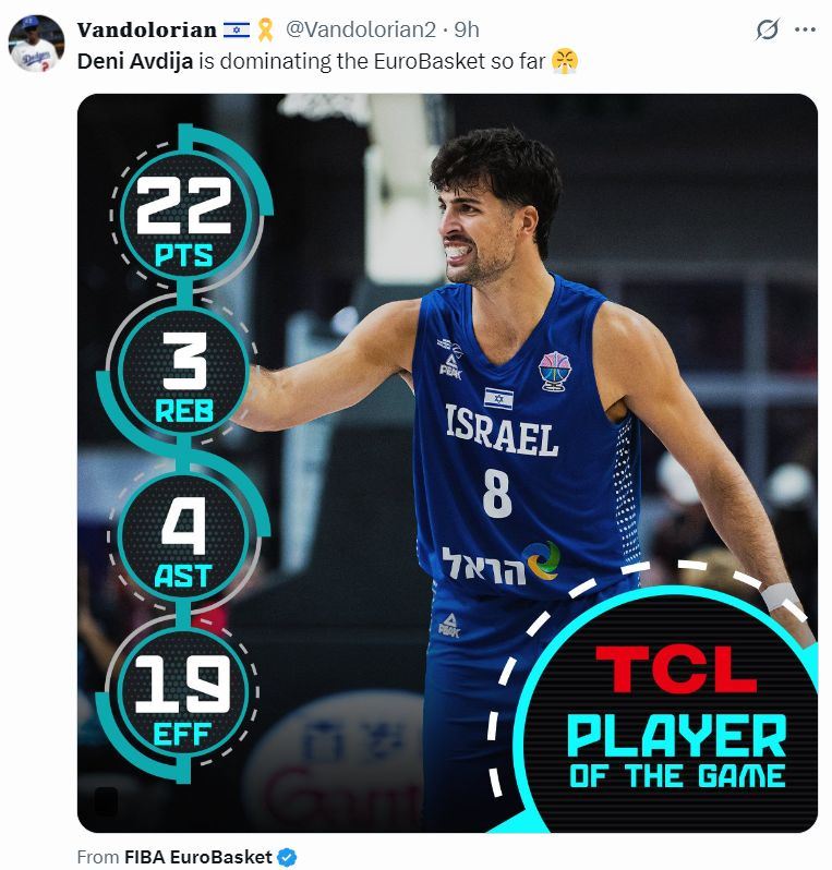 2025年男篮欧洲杯小组赛,以色列男篮92-89险胜比利时男篮,这场比赛以色列一度领先比利时达到21分之多,但领先过多后以色列全队的专注度明显下滑,比利时的外线手感起来后疯狂追分,好在末节决胜时刻以色列4罚3中锁定胜局,赛后球迷们将阿夫迪亚团团围住。