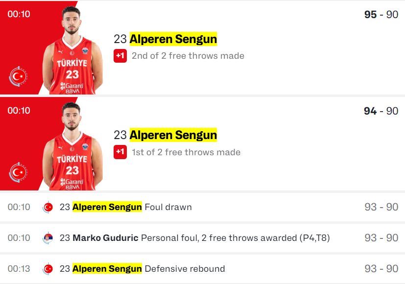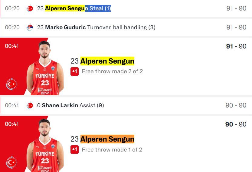 申京将球传给拉金后塞尔维亚只好犯规,拉金两罚全中后土耳其已经拉开到3分,终场前13秒约基奇三分不中,申京保护后场篮板,终场前10秒申京再度被犯规两罚全中直接锁定胜局。终场前41秒-终场前10秒申京1抢断+4罚全中直接帮助土耳其拿下胜利。