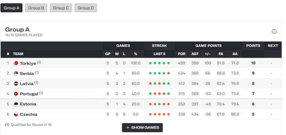 这场比赛后土耳其五连胜锁定A组第一,塞尔维亚则是4胜1负A组第二,拉脱维亚3胜2负第三,葡萄牙2胜3负第四,爱沙尼亚1胜4负第五,捷克五连败第六。谁也没想到土耳其今年在申京的带领下如此强势。