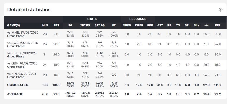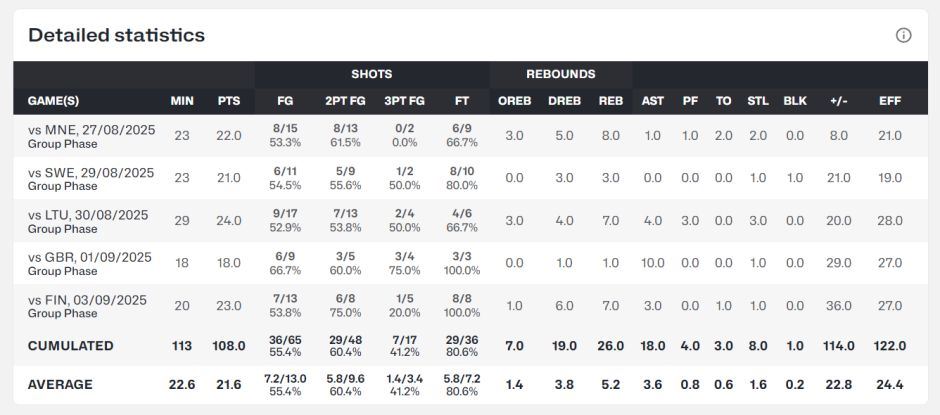 小瓦这五场小组赛四场拿到20+,他也是德国男篮唯一做到此数据的球员,场均22.6分钟,拿21.6分5.2篮板3.6助攻1.6抢断0.2盖帽,命中率55.4%,三分命中率41.2%。