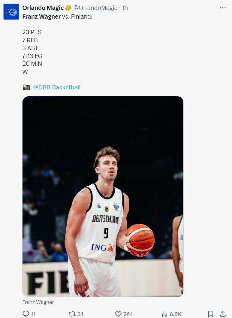 北京时间9月4日,2025年男篮欧洲杯小组赛,德国男篮91-61大胜芬兰男篮豪取五连胜。这是一场毫无悬念的比赛,马尔卡宁在小瓦的防守下毫无状态,而德国队这边4人上双多点开花,德国的紧迫盯人让芬兰出现多达21次的失误。