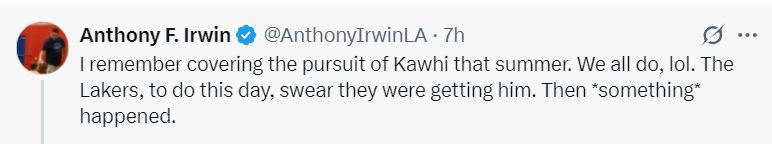 湖人记者安东尼-劳瑞恩:我记得那个夏天报道过湖人追逐科怀的过程。我们大家都记得,哈哈。湖人直到今天都坚称自己当时会拿下他。然后,发生了一些事情。
