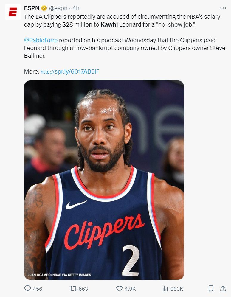 北京时间9月4日,ESPN已经发文报道了,科怀-伦纳德与洛杉矶快船涉嫌签下阴阳合同的事件,TA记者Pablo Torre透露小卡与一家涉嫌欺诈的碳中和公司存在一份虚假的代言合同,这份合同的代言费高达2800万,而这家公司的注资人是快船老板史蒂夫-鲍尔默。