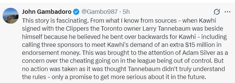 猛龙记者John Gambadoro:2019年夏科怀-伦纳德在决定自由球员去向签约快船之前,曾要求多伦多猛龙老板拉里-坦恩鲍姆为他争取额外1500万美元的代言收入。猛龙老板坦恩鲍姆还亲自联系了三家赞助商以满足科怀提出的额外1500万的代言费,这件事引起了萧华的注意他一度很担忧,但联盟并没有采取任何的行动。