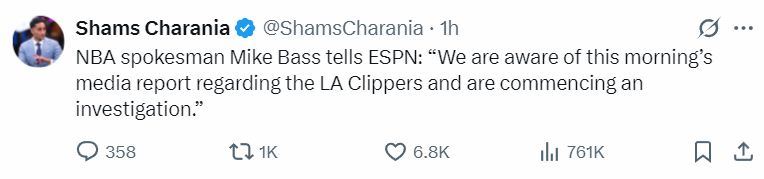 ESPN名记Shams已经透露,NBA发言人迈克-巴斯已经表示获悉有关洛杉矶快船的情况,联盟已经开始着手调查。