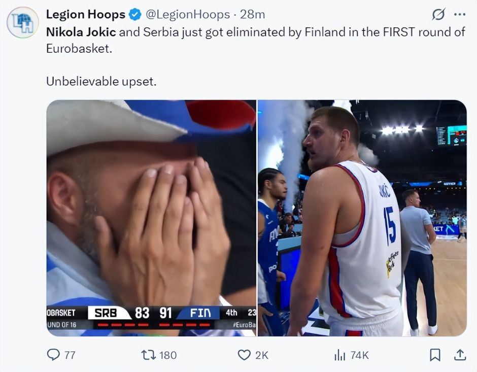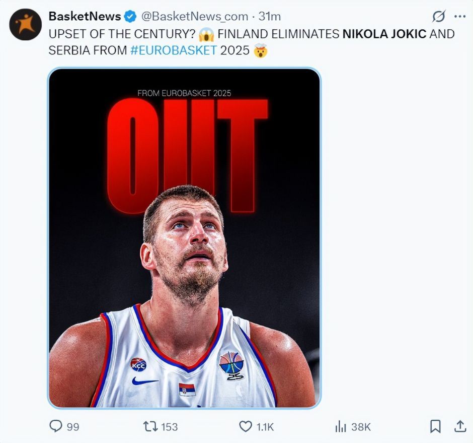 塞尔维亚男篮86-92不敌芬兰男篮无缘欧洲杯八强,欧洲媒体BasketNews高呼:世纪大冷门?约基奇所在的塞尔维亚被马尔卡宁所在的芬兰淘汰了。
