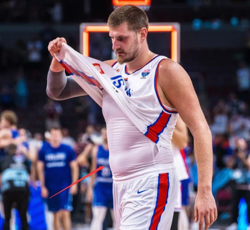 约基奇走向球员通道时露出了自己的大肚腩,虽然隔着一件运动背心,但还是能看出约老师的肚腩微微凸起,这也是约基奇的标志性肚腩。