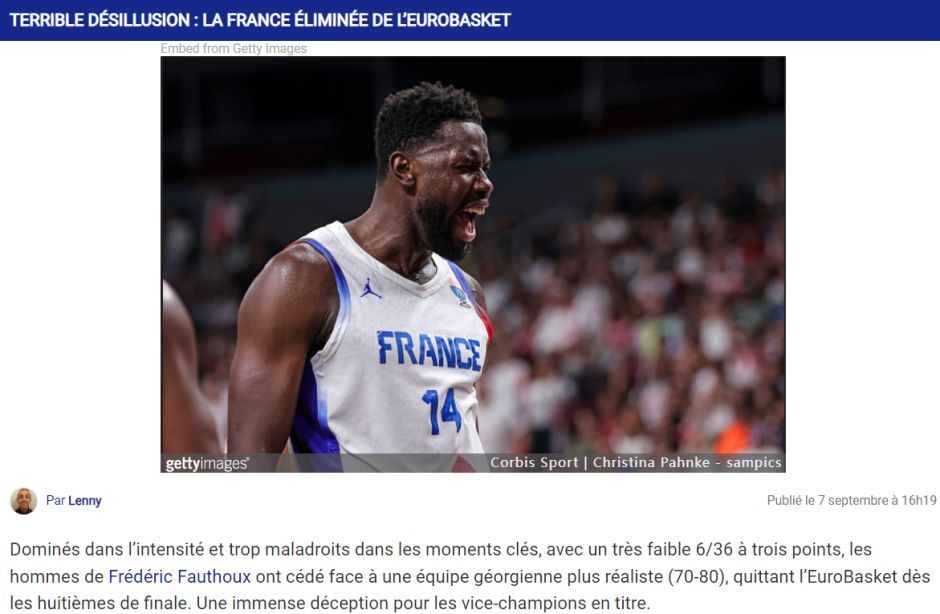 这篇文章非常之长,法国记者Par Lenny对法国男篮的表现非常不满,他开篇就写,这支法国队在关键时刻的表现太过于尴尬,他们竟然输给了欧洲赛场的弱旅格鲁吉亚,就连八强都未能进入是巨大的失望,上一届欧洲杯法国是第二名。