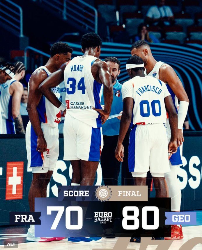 2025年男篮欧洲杯再度出现了大冷门,法国男篮70-80惨败格鲁吉亚男篮,这对于法国队来说是晴天霹雳啊,要知道法国男篮是上届的亚军,而且法国队中还有多位NBA球员:亚布塞莱、库利巴利、里萨谢、萨尔,除此之外马勒东、卡巴罗、霍尔德、奥科博都是打过NBA的选手。