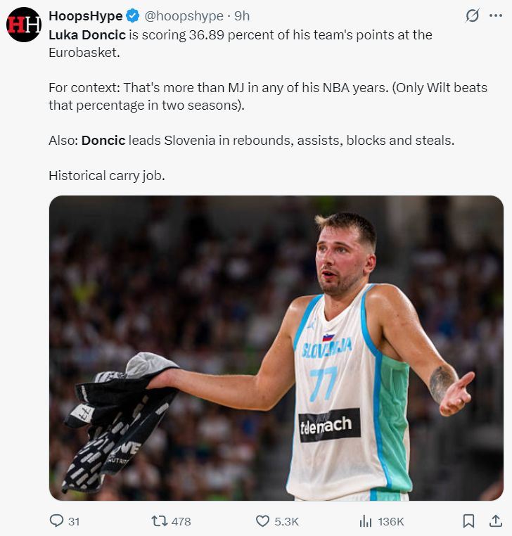 美媒HoopsHype写道:东契奇在今年的欧洲杯上球队贡献得分占比达到恐怖的36.89%,这比迈克尔-乔丹任何一个赛季的球队得分占比都要高,NBA历史只有张伯伦有两个赛季超过这个数字。此役东契奇篮板、得分、助攻、抢断、盖帽都是斯洛文尼亚第一,历史性的Carry工作。