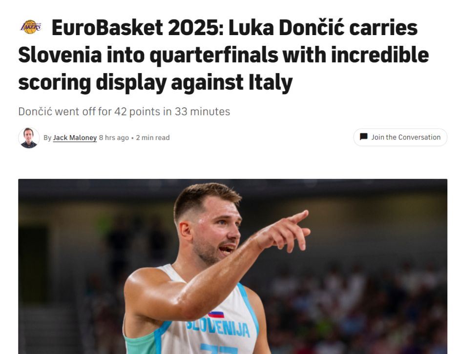斯洛文尼亚男篮84-77险胜意大利男篮晋级八强,这场比赛斯洛文尼亚是9人轮换,可得分上双的只有普雷佩里奇与东契奇两人,全队84分,东契奇一人拿到42分,换言之东契奇得分占比全队一半,东契奇就是天神下凡。